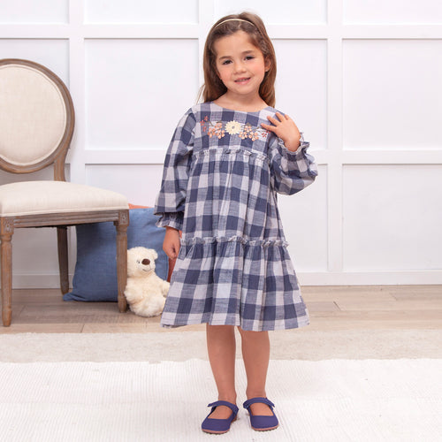 Buffalo Check Girls Cotton Dress with Floral Embroidery & Ruffles